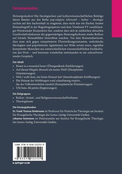 Heimatgedanken! Die theologischen und kulturwissenschaftlichen Beiträge dieses Bandes aus der Reihe pop.religion: lebensstil - kultur - theologie suchen auf den Sachverhalt zu reagieren, dass nicht nur ein flacher, bunter Heimatbegriff in der Regenbogenpresse und dem Vorabend-TV zweitklassiger Privatsender Konjunktur hat, sondern dass sich in zahleichen aktuellen Gesellschaftsdiskursen der gegenwärtigen Deutungskulturen starke Reflexe auf triviale Heimatbilder bemerkbar machen. Vor dem Konsenshorizont, dass man sich gegen romantisierte Übertreibungsszenarien, vorkritische Ideologien und populistische Agitationen zur Wehr setzen muss, ergreifen kompetente Menschen aus unterschiedlichen wissenschaftlichen Fachkulturen das Wort - und kommen wunderbar miteinander in ein zukunftsweisendes Gespräch.