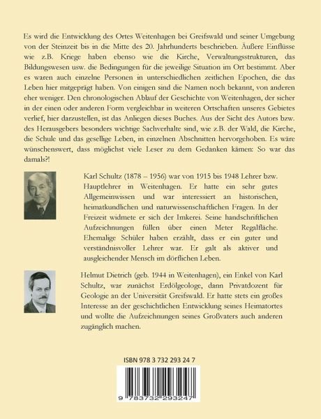 Es wird die Entwicklung des Ortes Weitenhagen bei Greifswald und seiner Umgebung von der Steinzeit bis in die Mitte des 20. Jahrhunderts beschrieben. Äußere Einflüsse wie z.B. Kriege haben ebenso wie die Kirche, Verwaltungsstrukturen, das Bildungswesen usw. die Bedingungen für die jeweilige Situation im Ort bestimmt. Aber es waren auch einzelne Personen in unterschiedlichen zeitlichen Epochen, die das Leben hier mitgeprägt haben. Von einigen sind die Namen noch bekannt, von anderen eher weniger. Den chronologischen Ablauf der Geschichte von Weitenhagen, der sicher in der einen oder anderen Form vergleichbar in weiteren Ortschaften unseres Gebietes verlief, hier darzustellen, ist das Anliegen dieses Buches. Aus der Sicht des Autors bzw. des Herausgebers besonders wichtige Sachverhalte sind, wie z.B. der Wald, die Kirche, die Schule und das gesellige Leben, in einzelnen Abschnitten hervorgehoben. Es wäre wünschenswert, dass möglichst viele Leser zu dem Gedanken kämen: So war das damals?!
