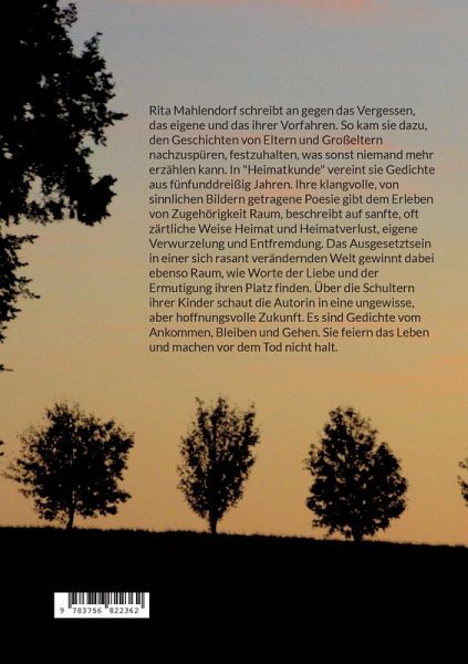 Rita Mahlendorf schreibt an gegen das Vergessen, das eigene und das ihrer Vorfahren. So kam sie dazu, den Geschichten von Eltern und Großeltern nachzuspüren, festzuhalten, was sonst niemand mehr erzählen kann. In "Heimatkunde" vereint sie Gedichte aus fünfunddreißig Jahren. Ihre klangvolle, von sinnlichen Bildern getragene Poesie gibt dem Erleben von Zugehörigkeit Raum, beschreibt auf sanfte, oft zärtliche Weise Heimat und Heimatverlust, eigene Verwurzelung und Entfremdung. Das Ausgesetztsein in einer sich rasant verändernden Welt gewinnt dabei ebenso Raum, wie Worte der Liebe und der Ermutigung ihren Platz finden. Über die Schultern ihrer Kinder schaut die Autorin in eine ungewisse, aber hoffnungsvolle Zukunft. Es sind Gedichte vom Ankommen, Bleiben und Gehen. Sie feiern das Leben und machen vor dem Tod nicht halt.