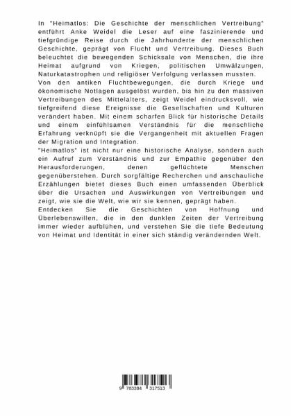 In "Heimatlos: Die Geschichte der menschlichen Vertreibung" entführt Anke Weidel die Leser auf eine faszinierende und tiefgründige Reise durch die Jahrhunderte der menschlichen Geschichte, geprägt von Flucht und Vertreibung. Dieses Buch beleuchtet die bewegenden Schicksale von Menschen, die ihre Heimat aufgrund von Kriegen, politischen Umwälzungen, Naturkatastrophen und religiöser Verfolgung verlassen mussten.Von den antiken Fluchtbewegungen, die durch Kriege und ökonomische Notlagen ausgelöst wurden, bis hin zu den massiven Vertreibungen des Mittelalters, zeigt Weidel eindrucksvoll, wie tiefgreifend diese Ereignisse die Gesellschaften und Kulturen verändert haben. Mit einem scharfen Blick für historische Details und einem einfühlsamen Verständnis für die menschliche Erfahrung verknüpft sie die Vergangenheit mit aktuellen Fragen der Migration und Integration."Heimatlos" ist nicht nur eine historische Analyse, sondern auch ein Aufruf zum Verständnis und zur Empathie gegenüber den Herausforderungen, denen geflüchtete Menschen gegenüberstehen. Durch sorgfältige Recherchen und anschauliche Erzählungen bietet dieses Buch einen umfassenden Überblick über die Ursachen und Auswirkungen von Vertreibungen und zeigt, wie sie die Welt, wie wir sie kennen, geprägt haben.Entdecken Sie die Geschichten von Hoffnung und Überlebenswillen, die in den dunklen Zeiten der Vertreibung immer wieder aufblühen, und verstehen Sie die tiefe Bedeutung von Heimat und Identität in einer sich ständig verändernden Welt.
