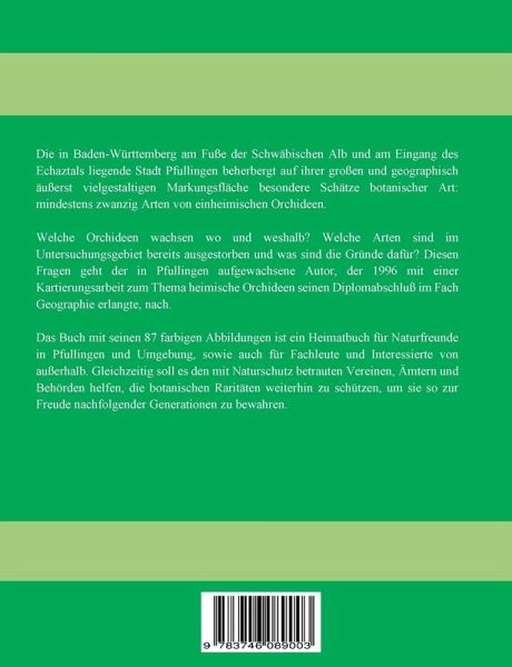 Die in Baden-Württemberg am Fuße der Schwäbischen Alb und am Eingang des Echaztals gelegene Stadt Pfullingen beherbergt auf ihrer großen und geographisch äußerst vielgestaltigen Markungsfläche besondere Schätze botanischer Art: mindestens zwanzig Arten von heimischen Orchideen.Welche Orchideen wachsen wo und weshalb? Welche Arten sind im Untersuchungsgebiet bereits ausgestorben und was sind die Gründe dafür? Diesen Fragen geht der in Pfullingen aufgewachsene Autor, der 1996 mit einer Kartierungsarbeit zum Thema Orchideen seinen Diplomabschluß im Fach Geographie erlangte, nach.Das Buch mit seinen 87 farbigen Abbildungen ist ein Heimatbuch für Naturfreunde in Pfullingen und Umgebung, sowie ein Leitfaden für Fachleute und Interessierte von außerhalb. Gleichzeitig soll es den mit Naturschutz betrauten Vereinen, Ämtern und Behörden helfen, die botanischen Raritäten weiterhin zu schützen, um sie so zur Freude nachfolgender Generationen zu bewahren.