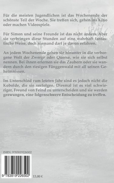 Für die meisten Jugendlichen ist das Wochenende der schönste Teil der Woche. Sie treffen sich, gehen ins Kino oder machen Videospiele. Für Simon und seine Freunde ist das nicht anders. Aber sie verbringen diese Stunden auf eine wahrhaft fantastische Weise, doch niemand darf je davon erfahren. An jedem Wochenende gehen sie hinunter in die verborgene Welt der Zwerge oder Querxe, wie sie sich selbst nennen. Bei ihnen erlernen sie das Zaubern oder sie wandern durch den riesigen Fänggenwald mit all seinen Geheimnissen. Im Unterschied zum letzten Jahr sind es jedoch nicht die Kobolde, die sie verfolgen. Diesmal ist es viel schwieriger, Freund von Feind zu unterscheiden und sie werden gezwungen, eine folgenschwere Entscheidung zu treffen.