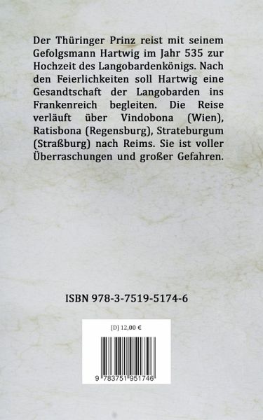 Der Thüringer Prinz reist mit seinem Gefolgsmann Hartwig im Jahr 535 zur Hochzeit des Langobardenkönigs. Nach den Feierlichkeiten soll Hartwig eine Gesandtschaft der Langobarden ins Frankenreich begleiten. Die Reise verläuft über Vindobona (Wien), Ratisbona (Regensburg), Strateburgum (Straßburg) nach Reims. Sie ist voller Überraschungen und großer Gefahren.