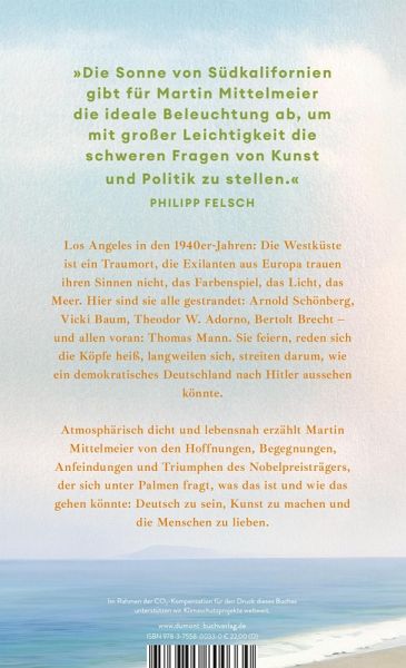 »Wie kann man über Thomas Mann heute schreiben? So: geistreich, komisch und mit lässigem Ernst.« SASA STANISICAtmosphärisch dicht erzählt Martin Mittelmeier von den Hoffnungen, Begegnungen und Zweifeln des Nobelpreisträgers Thomas Mann, der mit fast siebzig Jahren unter der kalifornischen Sonne seine Werte hinterfragen musste. Los Angeles in den 1940er-Jahren. Hier sind sie gestrandet, die im Deutschland der Nationalsozialisten keine Heimat mehr haben oder haben wollen: Arnold Schönberg, Theodor W. Adorno, Lion Feuchtwanger, Bertolt Brecht, Helene Weigel, Max Horkheimer, Vicki Baum, Hanns Eisler, Franz und Alma Werfel - und allen voran: Thomas Mann, der Jahrhundertschriftsteller. Bei Drinks tauschen sie sich intellektuell, künstlerisch und politisch aus, doch die paradiesische Umgebung bildet einen seltsamen Kontrast zu den bedrückenden Nachrichten aus Europa. Denn das Leben hier in Pacific Palisades kreist vor allem um die Frage nach der in der deutschen Kultur und Sprache verwurzelten Identität, die mehr und mehr gefährdet scheint. Was kann Kunst, deutsche Kunst angesichts des Schreckens sein? Thomas Mann sucht nach Antworten, sendet Radioansprachen an »Deutsche Hörer« und spürt in 'Doktor Faustus' den Wurzeln des Nationalsozialismus nach. »Die Sonne von Südkalifornien gibt für Martin Mittelmeier die ideale Beleuchtung ab, um mit großer Leichtigkeit die schweren Fragen von Kunst und Politik zu stellen.« PHILIPP FELSCH