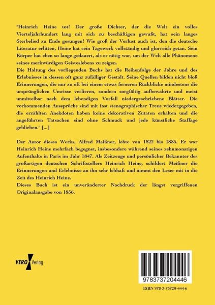 Der Autor dieses Werks, Alfred Meißner, lebte von 1822 bis 1885. Er war Heinrich Heine mehrfach begegnet, insbesondere während seines zehnmonatigen Aufenthalts in Paris im Jahr 1847. Als Zeitzeuge und persönlicher Bekannter des großartigen deutschen Schriftstellers Heinrich Heine, schildert Meißner die Erinnerungen und Erlebnisse an ihn sehr lebhaft und nimmt den Leser mit in die Zeit des Heinrich Heine.