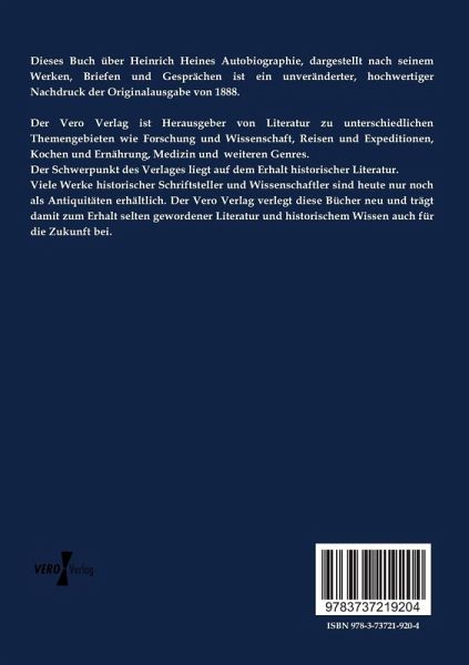 Dieses Buch über Heinrich Heines Autobiographie, dargestellt nach seinem Werken, Briefen und Gesprächen ist ein unveränderter, hochwertiger Nachdruck der Originalausgabe von 1888. Der Vero Verlag ist Herausgeber von Literatur zu unterschiedlichen Themengebieten wie Forschung und Wissenschaft, Reisen und Expeditionen, Kochen und Ernährung, Medizin und weiteren Genres. Der Schwerpunkt des Verlages liegt auf dem Erhalt historischer Literatur. Viele Werke historischer Schriftsteller und Wissenschaftler sind heute nur noch als Antiquitäten erhältlich. Der Vero Verlag verlegt diese Bücher neu und…mehr