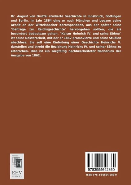 Dr. August von Druffel studierte Geschichte in Innsbruck, Göttingen und Berlin. Im Jahr 1864 ging er nach München und begann seine Arbeit an der Wittelsbacher Korrespondenz, aus der später seine "Beiträge zur Reichsgeschichte" hervorgehen sollten, die als besonders bedeutsam gelten. "Kaiser Heinrich IV. und seine Söhne" ist seine Doktorarbeit, mit der er 1862 promovierte und seine Studien abschloss. Sie soll eine Einleitung einer Geschichte Heinrichs V. darstellen und strebt die Beziehung Heinrichs IV. und seiner Söhne zu erforschen. Dies ist ein sorgfältig nachbearbeiteter Nachdruck der Ausgabe von 1862.