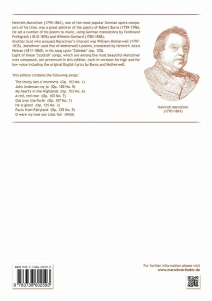 Heinrich Marschner (1795-1861), one of the most popular German opera composers of his time, was a great admirer of the poetry of Robert Burns (1759-1796). He set a number of his poems to music, using German translations by Ferdinand Freiligrath (1810-1876) and Wilhelm Gerhard (1780-1858).Another Scot who aroused Marschner's interest was William Motherwell (1797-1835). Marschner used five of Motherwell's poems, translated by Heinrich Julius Heinze (1811-1860), in his song cycle "Caledon" (op. 125). Eight of these "Scottish" songs, which are among the most beautiful Marschner ever composed, are presented in this edition, each in versions for high and for low voice including the original English lyrics by Burns and Motherwell. -- -- -- The lovely lass o' Inverness (Op. 103 No. 1) / John Anderson my jo (Op. 103 No. 5) / My heart's in the Highlands (Op. 103 No. 6) / A red, red rose (Op. 103 No. 7) / Out over the Forth (Op. 107 No. 1) / He is gone (Op. 125 No. 3) / Facts fromFairyland (Op. 125 No. 5) / O were my love yon Lilac fair (WoO) -- -- -- For further information please visit our website: www.marschnerlieder.de
