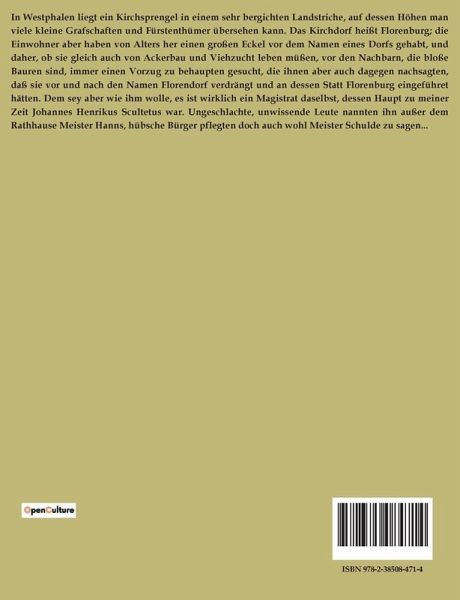 In Westphalen liegt ein Kirchsprengel in einem sehr bergichten Landstriche, auf dessen Höhen man viele kleine Grafschaften und Fürstenthümer übersehen kann. Das Kirchdorf heißt Florenburg; die Einwohner aber haben von Alters her einen großen Eckel vor dem Namen eines Dorfs gehabt, und daher, ob sie gleich auch von Ackerbau und Viehzucht leben müßen, vor den Nachbarn, die bloße Bauren sind, immer einen Vorzug zu behaupten gesucht, die ihnen aber auch dagegen nachsagten, daß sie vor und nach den Namen Florendorf verdrängt und an dessen Statt Florenburg eingeführet hätten. Dem sey aber wie ihm wolle, es ist wirklich ein Magistrat daselbst, dessen Haupt zu meiner Zeit Johannes Henrikus Scultetus war. Ungeschlachte, unwissende Leute nannten ihn außer dem Rathhause Meister Hanns, hübsche Bürger pflegten doch auch wohl Meister Schulde zu sagen...