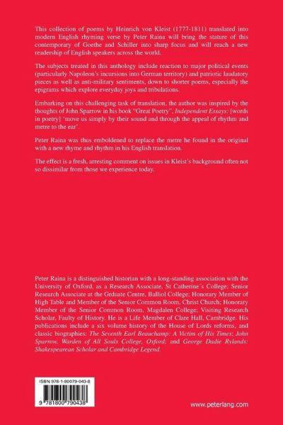 This collection of poems by Heinrich von Kleist (1777-1811) translated into modern English rhyming verse by Peter Raina will bring the stature of this contemporary of Goethe and Schiller into sharp focus and will reach a new readership of English speakers across the world.