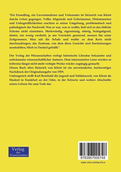Umfangreich stellt Karl Reinhold die Jugendund Soldatenzeit, von Kleist als Student in Frankfurt an der Oder, in der Schweiz und weitere Abschnitte seines Lebens bis zum Tode dar.