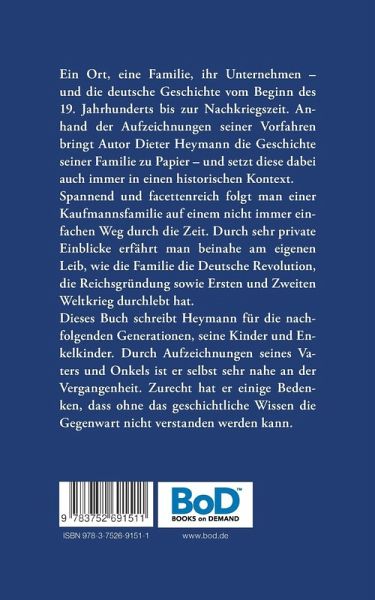 Ein Ort, eine Familie, ihr Unternehmen - und die deutsche Geschichte vom Beginn des 19. Jahrhunderts bis zur Nachkriegszeit. Anhand der Aufzeichnungen seiner Vorfahren bringt Autor Dieter Heymann die Geschichte seiner Familie zu Papier - und setzt diese dabei auch immer in einen historischen Kontext. Spannend und facettenreich folgt man einer Kaufmannsfamilie auf einem nicht immer einfachen Weg durch die Zeit. Durch sehr private Einblicke erfährt man beinahe am eigenen Leib, wie die Familie die Deutsche Revolution, die Reichsgründung sowie Ersten und Zweiten Weltkrieg durchlebt hat.Dieses Buch schreibt Heymann für die nachfolgenden Generationen, seine Kinder und Enkelkinder. Durch Aufzeichnungen seines Vaters und Onkels ist er selbst sehr nahe an der Vergangenheit. Zurecht hat er einige Bedenken, dass ohne das geschichtliche Wissen die Gegenwart nicht verstanden werden kann.