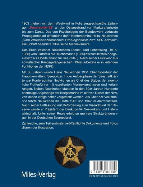 1963 trieben mit dem Westwind in Folie eingeschweißte Zeitungen "Feuerschiff 63" an den Ostseestrand von Markgrafenheide bis zum Darss. Das von Psychologen der Bundeswehr verfasste Propagandablatt diffamierte darin Konteradmiral Heinz Neukirchen "Vom Nationalsozialistischen Führungsoffizier zum SED-Admiral". Die Schrift beendete 1964 seine Marinekarriere. Das Buch zeichnet Neukirchens Dienst- und Lebensweg (1915-1986) vom Eintritt in die Reichsmarine (1935) bis zum letzten Kriegseinsatz als Oberleutnant zur See im April und Mai 1945. Nach seiner Rückkehr 1949 aus russischer Kriegsgefangenschaft arbeitete er in leitenden Funktionen der NDPD. Mit 36 Jahren wurde Heinz Neukirchen 1951 Chefinspekteur in der Hauptverwaltung Seepolizei. In der Aufbauphase der Seestreitkräfte war Konteradmiral Neukirchen als Stabschef der einzige Flottenführer, mit ausgeprägten Marinekenntnissen und -erfahrungen. Neben Neukirchen standen in den 50er-Jahren hunderte ehemalige Angehörige der Kriegsmarine im aktiven Dienst der NVA. Als Chef der Volksmarine führte Neukirchen die Flotte 1961 und 1962 im monatelangen Alarmzustand. Nach seiner Entlassung mit Beförderung zum Vizeadmiral der Reserve wurde er Präsident der Direktion für Seeverkehr und Hafenwirtschaft. Zahlreiche, zum Teil erstmals veröffentlichte Dokumente und Fotos dienen der Illustration.