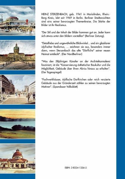 HEINZ STERZENBACH, geb. 1941 in Marialinden, Rhein.- Berg.-Kreis, lebt seit 1969 in Berlin. Berliner Stadtansichten sind eins seiner bevorzugten Themenkreise. Die Stärke der Bilder ist ihr Realismus. "Der Stil und der Inhalt der Bilder kommen gut an. Jeder kann sich etwas unter den Bildern vorstellen" (Berliner Zeitung). "Detailliebe und ungewöhnliche Blickwinkel... und ein glasklarer idyllischer Realismus,... zeichnen sie aus, besonders immer dann, wenn Sterzenbach das alte "Dörfliche" seiner neuen Heimat entdeckt". (Der NordBerliner) "Was den 58jährigen Künstler an der Architekturmalerei fasziniert, ist die "Konservierung ästhetischer Baukultur und die Möglichkeit, Gebäude über ihren Abriß hinaus zu erhalten".(Der Tagesspiegel) "Fachwerkhäuser, idyllische Dorfkirchen oder reich verzierte Gebäude aus der Gründerzeit zählen zu seinen bevorzugten Motiven". (Spandauer Volksblatt) Es gibt viele Bildbände über Berlin, aber meist haben sie einen thematischen Schwerpunkt oder es werden nur die highlights gezeigt. In dem neuen Katalog von Heinz Sterzenbach findet der interessierte Berlin-Liebhaber erstmalig Bilder aus fast allen Bezirken und Ortsteilen von Berlin und Umgebung in einem Katalog. Die Bezirke und Ortsteile sind alphabetisch geordnet.