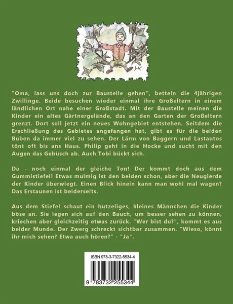 "Oma, lass uns doch zur Baustelle gehen", betteln die 4jährigen Zwillinge. Beide besuchen wieder einmal ihre Großeltern in einem ländlichen Ort nahe einer Großstadt. Mit der Baustelle meinen die Kinder ein altes Gärtnergelände, das an den Garten der Großeltern grenzt. Dort soll jetzt ein neues Wohngebiet entstehen. Seitdem die Erschließung des Gebietes angefangen hat, gibt es für die beiden Buben da immer viel zu sehen. Der Lärm von Baggern und Lastautos tönt oft bis ans Haus. Philip geht in die Hocke und sucht mit den Augen das Gebüsch ab. Auch Tobi bückt sich. Da - noch einmal der gleiche Ton! Der kommt doch aus dem Gummistiefel! Etwas mulmig ist den beiden schon, aber die Neugierde der Kinder überwiegt. Einen Blick hinein kann man wohl mal wagen? Das Erstaunen ist beiderseits. Aus dem Stiefel schaut ein hutzeliges, kleines Männchen die Kinder böse an. Sie legen sich auf den Bauch, um besser sehen zu können, kriechen aber gleichzeitig etwas zurück. "Wer bist du?", kommt es aus beider Munde. Der Zwerg schreckt sichtbar zusammen. "Wieso, könnt ihr mich sehen? Etwa auch hören?" - "Ja".