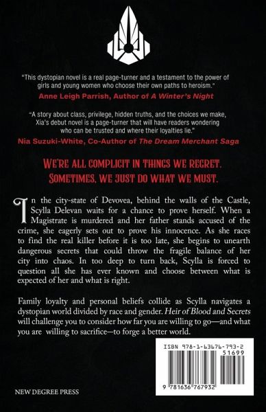 "We're all complicit in things we regret. Sometimes, we just do what we must." In the city-state of Devovea, behind the walls of the Castle, Scylla Delevan waits for a chance to prove herself. When a Magistrate is murdered and her father stands accused of the crime, she eagerly sets out to prove his innocence. As she races to find the real killer before it is too late, she begins to unearth dangerous secrets that could throw the fragile balance of her city into chaos. In too deep to turn back, Scylla is forced to question all she has ever known and choose between what is expected of her and what is right. Family loyalty and personal beliefs collide as Scylla navigates a dystopian world divided by race and gender. Heir of Blood and Secrets will challenge you to consider how far you are willing to go-and what you are willing to sacrifice-to forge a better world.