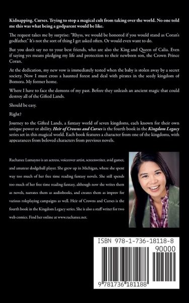 Kidnapping. Curses. Trying to stop a magical cult from taking over the world. No one told me this was what being a godparent would be like. No one is more surprised than me when I get the request: "Rhyss, we would be honored if you would stand as Coran's godfather." For this happy-go-lucky mercenary, it's not the sort of thing I get asked often. Or would even want to do. But you don't say no to your best friends, who also happen to be the King and Queen of Calia. Even if saying yes means pledging my life and protection to their newborn son, the Crown Prince Coran. At the dedication, my new vow is immediately tested when the baby is stolen away by a secret society. Now I, along with Farrah, another dear friend, must cross a haunted forest and deal with pirates in the seedy kingdom of Bomora. My former home. Where I have to face the demons of my past. Before they unleash an ancient magic that could destroy all of the Gifted Lands. Should be easy. Right? Journey to the Gifted Lands, a fantasy world of seven kingdoms, each known for their own unique power or ability. Heir of Crowns and Curses is the fourth book in the Kingdom Legacy series set in this magical world. Each book features a character from one of the kingdoms, with appearances from beloved characters from previous novels.