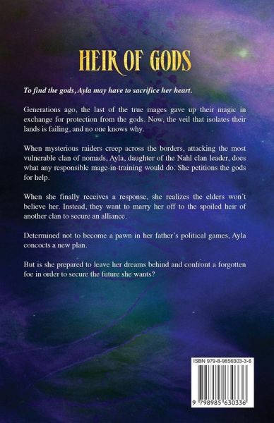 To find the gods, Ayla may have to sacrifice her heart. Generations ago, the last of the true mages gave up their magic in exchange for protection from the gods. Now, the veil that isolates their lands is failing, and no one knows why. When mysterious raiders creep across the borders, attacking the most vulnerable clan of nomads, Ayla, daughter of the Nahl clan leader, does what any responsible mage-in-training would do. She petitions the gods for help. When she finally receives a response, she realizes the elders won't believe her. Instead, they want to marry her off to the spoiled heir of another clan to secure an alliance. Determined not to become a pawn in her father's political games, Ayla concocts a new plan. But is she prepared to leave her dreams behind and confront a forgotten foe in order to secure the future she wants?