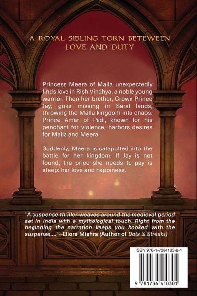 Princess Meera of Malla unexpectedly finds love in Rish Vindhya, a noble young warrior. Then her brother, Crown Prince Jay, goes missing in Saral lands, throwing the Malla kingdom into chaos. Prince Amar of Padi, known for his penchant for violence, harbors desires for Malla and Meera. Suddenly, Meera is catapulted into the battle for her kingdom. If Jay is not found, the price she needs to pay is steep, her love and happiness. Coming of Age story of a royal sibling torn between love and duty. Based loosely on medieval India, this family saga of the Malla dynasty takes us through Meera's struggles, uncovering treason, royal secrets, and shattered hearts.
