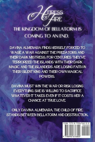 The kingdom of Bellatorm is coming to an end. Davina Almenara finds herself forced to wage a war against the Predators and their Dark Mistress. For centuries they've terrorized the islands with their dark magic. And the islanders are losing faith in their silent King and their own magical powers. Davina must win the war or risk losing everything. She is willing to sacrifice whatever it takes even if it costs her a chance at true love. Only Davina Almenara, the child of fire, stands between Bellatorm and destruction.