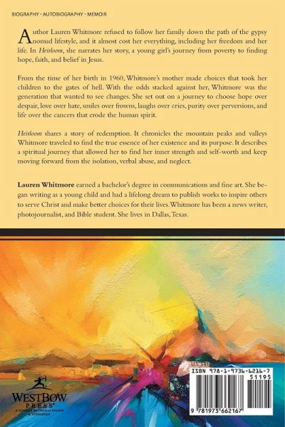 Author Lauren Whitmore refused to follow her family down the path of the gypsy nomad lifestyle, and it almost cost her everything, including her freedom and her life. In Heirloom, she narrates her story, a young girl's journey from poverty to finding hope, faith, and belief in Jesus. From the time of her birth in 1960, Whitmore's mother made choices that took her children to the gates of hell. With the odds stacked against her, Whitmore was the generation that wanted to see changes. She set out on a journey to choose hope over despair, love over hate, smiles over frowns, laughs over cries, purity over perversions, and life over the cancers that erode the human spirit. Heirloom shares a story of redemption. It chronicles the mountain peaks and valleys Whitmore traveled to find the true essence of her existence and its purpose. It describes a spiritual journey that allowed her to find her inner strength and self-worth and keep moving forward from the isolation, verbal abuse, and neglect.
