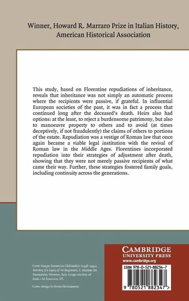 This study, based on Florentine repudiations of inheritance, reveals that inheritance was not simply an automatic process where the recipients were passive, if grateful. In influential European societies of the past, it was in fact a process that continued long after the deceased's death. Heirs also had options: at the least, to reject a burdensome patrimony, but also to manoeuvre property to others and to avoid (at times deceptively, if not fraudulently) the claims of others to portions of the estate. Repudiation was a vestige of Roman law that once again became a viable legal institution with the revival of Roman law in the Middle Ages. Florentines incorporated repudiation into their strategies of adjustment after death, showing that they were not merely passive recipients of what came their way. Further, these strategies fostered family goals, including continuity across the generations.