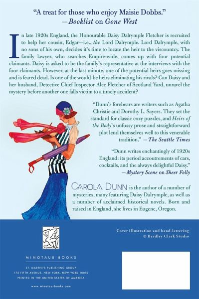 The Daisy Dalrymple series continues in Heirs of the Body-when one of four potential claimants to the title of Lord Dalrymple dies a sudden, nasty death, the question on everyone's mind is, "was it murder"? In the late 1920's in England, The Honourable Daisy Dalrymple Fletcher is recruited to help her cousin Edgar-i.e. the Lord Dalrymple. About to turn fifty, Lord Dalrymple decides it is time to find out who would be the heir to the viscountcy. With the help of the family lawyer, who advertises Empire-wide, they have come up with four potential claimants. For his fiftieth birthday, Edgar invites those would-be heirs-along with Daisy and the rest of the family-to Fairacres, the family estate. In the meantime, Daisy is asked to be the family's representative at the lawyer's interviews with the claimants. Those four are a hotelier from Scarborough, a diamond merchant from South Africa, a young mixed-raced boy from Trinidad, and a sailor from Jamaica. However, according to his very pregnant wife, the sailor has gone missing. Daisy and Alec must uncover a conspiracy if they are going to stop the killing in the latest from the accomplished master of the genre, Carola Dunn.