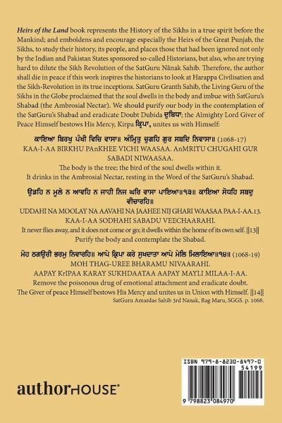 Heirs of the Land book represents the History of the Sikhs in a true spirit before the Mankind; and emboldens and encourage especially the Heirs of the Great Punjab, the Sikhs, to study their history, its people, and places those that had been ignored not only by the Indian and Pakistan States sponsored so-called Historians, but also, who are trying hard to dilute the Sikh Revolution of the SatGuru Nnak Sahib. Therefore, the author shall die in peace if this work inspires the historians to look at Harappa Civilisation and the Sikh-Revolution in its true inceptions. SatGuru Granth Sahib, the Living Guru of the Sikhs in the Globe proclaimed that the soul dwells in the body and imbue with SatGuru's Shabad (the Ambrosial Nectar). We should purify our body in the contemplation of the SatGuru's Shabad and eradicate Doubt Dubida duibDw; the Almighty Lord Giver of Peace Himself bestows His Mercy, Kirpa ikRpw, unites us with Himself: kwieAw ibrKu pMKI ivic vwsw] AMimRqu cugih gur sbid invwsw] (1068-17) KAA-I-AA BIRKHU PAnKHEE VICHI WAASAA. AnMRITU CHUGAHI GUR SABADI NIWAASAA. The body is the tree; the bird of the soul dwells within it. It drinks in the Ambrosial Nectar, resting in the Word of the SatGuru's Shabad. aufih n mUly n Awvih n jwhI inj Gir vwsw pwieAw]13] kwieAw soDih sbdu vIcwrih] UDDAHI NA MOOLAY NA AAVAHI NA JAAHEE NIJ GHARI WAASAA PAA-I-AA.13. KAA-I-AA SODHAHI SABADU VEECHAARAHI. It never flies away, and it does not come or go; it dwells within the home of its own self. 13 Purify the body and contemplate the Shabad. moh TgaurI Brmu invwrih] Awpy ik®pw kry suKdwqw Awpy myil imlwieAw]14] (1068-19) MOH THAG-UREE BHARAMU NIVAARAHI. AAPAY KrIPAA KARAY SUKHDAATAA AAPAY MAYLI MILAA-I-AA. Remove the poisonous drug of emotional attachment and eradicate doubt. The Giver of peace Himself bestows His Mercy and unites us in Union with Himself. 14 SatGuru Amardas Sahib 3rd Nanak, Rag Maru, SGGS. p. 1068.