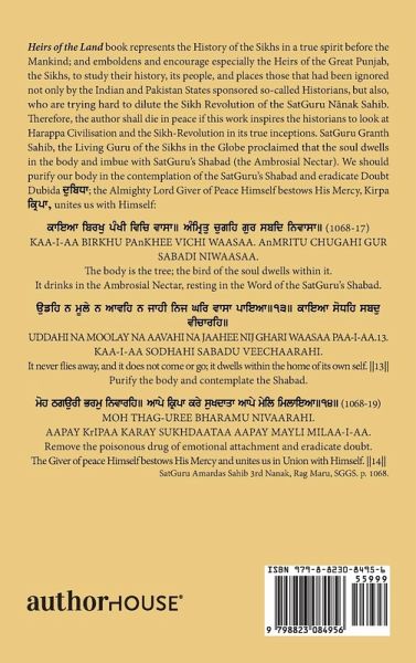 Heirs of the Land book represents the History of the Sikhs in a true spirit before the Mankind; and emboldens and encourage especially the Heirs of the Great Punjab, the Sikhs, to study their history, its people, and places those that had been ignored not only by the Indian and Pakistan States sponsored so-called Historians, but also, who are trying hard to dilute the Sikh Revolution of the SatGuru Nnak Sahib. Therefore, the author shall die in peace if this work inspires the historians to look at Harappa Civilisation and the Sikh-Revolution in its true inceptions. SatGuru Granth Sahib, the Living Guru of the Sikhs in the Globe proclaimed that the soul dwells in the body and imbue with SatGuru's Shabad (the Ambrosial Nectar). We should purify our body in the contemplation of the SatGuru's Shabad and eradicate Doubt Dubida duibDw; the Almighty Lord Giver of Peace Himself bestows His Mercy, Kirpa ikRpw, unites us with Himself: kwieAw ibrKu pMKI ivic vwsw] AMimRqu cugih gur sbid invwsw] (1068-17) KAA-I-AA BIRKHU PAnKHEE VICHI WAASAA. AnMRITU CHUGAHI GUR SABADI NIWAASAA. The body is the tree; the bird of the soul dwells within it. It drinks in the Ambrosial Nectar, resting in the Word of the SatGuru's Shabad. aufih n mUly n Awvih n jwhI inj Gir vwsw pwieAw]13] kwieAw soDih sbdu vIcwrih] UDDAHI NA MOOLAY NA AAVAHI NA JAAHEE NIJ GHARI WAASAA PAA-I-AA.13. KAA-I-AA SODHAHI SABADU VEECHAARAHI. It never flies away, and it does not come or go; it dwells within the home of its own self. 13 Purify the body and contemplate the Shabad. moh TgaurI Brmu invwrih] Awpy ik®pw kry suKdwqw Awpy myil imlwieAw]14] (1068-19) MOH THAG-UREE BHARAMU NIVAARAHI. AAPAY KrIPAA KARAY SUKHDAATAA AAPAY MAYLI MILAA-I-AA. Remove the poisonous drug of emotional attachment and eradicate doubt. The Giver of peace Himself bestows His Mercy and unites us in Union with Himself. 14 SatGuru Amardas Sahib 3rd Nanak, Rag Maru, SGGS. p. 1068.