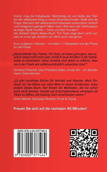 Keiner mag die Kaltakquise. Gleichzeitig ist und bleibt das Telefon der effektivste Weg zu neuen Business-Kunden. Stellt sich die Frage: Wie kann der telefonische Erstkontakt authentisch, einfach und überdurchschnittlich erfolgreich gelingen? Mehr noch: Wie kann die Telefonakquise sogar Spaß machen - Ihnen und dem Kunden?Die Antwort liefert dieses Buch. Der Autor zeigt darin nicht nur, WAS es zu tun gilt, sondern vor allem auch: WIE genau.Kurz, prägnant, relevant - mit vielen 1:1- Beispielen aus der Praxis für die Praxis.Aus dem Inhalt:Heißstart: Akquise-Telefonate live Kaltakquise: Schluss mit Schema FVorbereitung: Darauf sollten Sie achtenWie Sie das Vorzimmer erobernSo gewinnen Sie den EntscheiderDeutschlands Top-Trainer, Tim Taxis, ist etwas gelungen, was es schon lange nicht mehr gab: wirklich neue Ansätze in der Kaltakquise zu entwickeln. Diese Ansätze sind dabei so effektiv, dass sie in der Praxis wie selbstverständlich umsetzbar sind.Christian Petschik, Vice President Sales, arvato AG - ein Bertelsmann Unternehmen