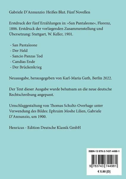 Gabriele D'Annunzio: Heißes Blut. Fünf NovellenErstdruck der fünf Erzählungen in: »San Pantaleone«, Florenz, 1886. Erstdruck der vorliegenden Zusammenstellung und Übersetzung: Stuttgart, W. Keller, 1901.Inhaltsverzeichnis:Heißes Blut.San Pantaleone.Der Held.Sancio Panzas Tod.Candias Ende.Der Brückenkrieg.Neuausgabe, herausgegeben von Karl-Maria Guth, Berlin 2023.Der Text dieser Ausgabe wurde behutsam an die neue deutsche Rechtschreibung angepasst.Umschlagabbildung: Ephraim Moshe Lilien, Gabriele D'Annunzio, um 1900Gesetzt aus der Minion Pro, 11 pt.Die Sammlung Hofenberg erscheint im Verlag Henricus - Edition Deutsche Klassik GmbH, Berlin