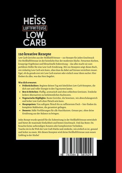Low Carb Gerichte aus der Heißluftfritteuse - 120 Rezepte für jeden Geschmack.Die Heißluftfritteuse ist der heimliche Star der modernen Küche. Fettarmes Kochen, knusprige Ergebnisse und blitzschnelle Zubereitung - das alles macht sie zum perfekten Helfer für eine Low Carb Ernährung. Mit 222 Rezepten zeigt dieses Buch, wie vielseitig Low Carb sein kann, ohne dass du dabei auf Genuss verzichten musst. Egal, ob du gerade erst mit Low Carb startest oder einfach neue Ideen suchst: Hier findest du alles, was das Herz begehrt.Was dich erwartet:-Frühstücksideen: Beginne deinen Tag mit köstlichen Low Carb Rezepten, die dich satt und voller Energie in den Tag starten lassen.-Brot & Brötchen: Fluffig, aromatisch und ohne schlechtes Gewissen. Entdecke leckere Alternativen zu herkömmlichen Backwaren.-Vegetarische Highlights: Bunte Gerichte, die beweisen, wie abwechslungsreich und lecker Low Carb ohne Fleisch sein kann.-Hauptspeisen: Von saftigem Fleisch bis zu raffiniertem Fisch - hier findest du komplette Mahlzeiten, die garantiert gelingen.-Desserts: Süße Verführungen für alle Naschkatzen. Genuss pur, ohne deine Ernährung aus der Balance zu bringen...Jedes Rezept wurde speziell für die Zubereitung in der Heißluftfritteuse entwickelt und bietet dir maximale Einfachheit und besten Geschmack. Und das Beste: Du brauchst keine aufwendigen Zutaten oder komplizierten Techniken.Tauche ein in die Welt der Low Carb Küche und entdecke, wie einfach es ist, gesund und lecker zu essen. Mit diesen Rezepten wird deine Heißluftfritteuse zum neuen Liebling in der Küche!