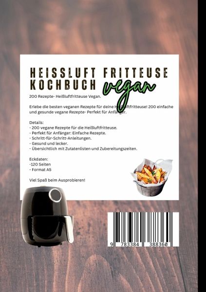 200 Rezepte- Heißluftfritteuse Vegan.Erlebe die besten veganen Rezepte für deine Heißluftfritteuse! 200 einfache und gesunde vegane Rezepte- Perfekt für Anfänger.Details:- 200 vegane Rezepte für die Heißluftfritteuse.- Perfekt für Anfänger: Einfache Rezepte.- Schritt-für-Schritt-Anleitungen.- Gesund und lecker.- Übersichtlich mit Zutatenlisten und Zubereitungszeiten.Eckdaten: -120 Seiten- Format A5Viel Spaß beim Ausprobieren!