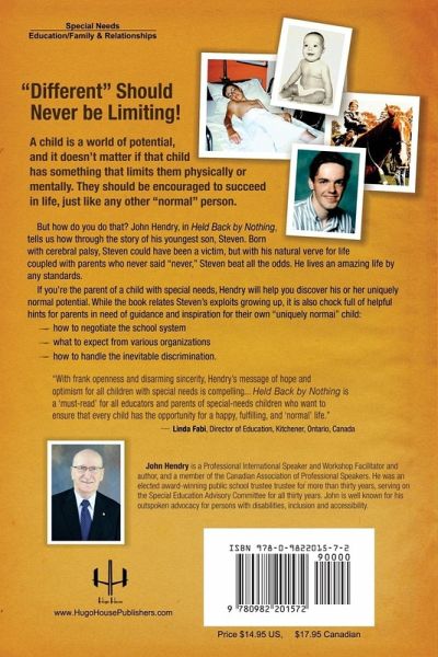 Held Back by Nothing is possibly one of the greatest inspirational books ever written to help parents of children with a disability. The story and the message is timeless. It is based on the life of his youngest son born with cerebral palsy. The book offers tips and real life situations to help give parents hope that; like his son, they can be okay as they make their journey through childhood to becoming young adults. The thesis of the book is never allowing anyone to define what their childcan do, or what is in their future. This is the new 2nd Edition - with updated images and story.