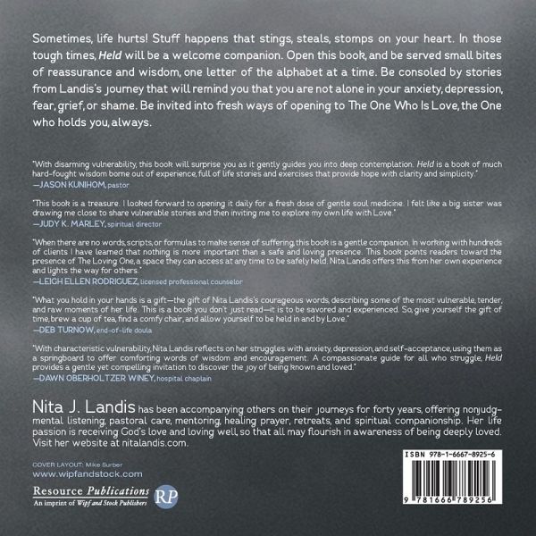 Sometimes, life hurts! Stuff happens that stings, steals, stomps on your heart. In those tough times, Held will be a welcome companion. Open this book, and be served small bites of reassurance and wisdom, one letter of the alphabet at a time. Be consoled by stories from Landis's journey that will remind you that you are not alone in your anxiety, depression, fear, grief, or shame. Be invited into fresh ways of opening to The One Who Is Love, the One who holds you, always.