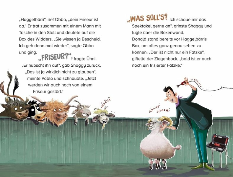 Leicht lesbare Geschichten mit Comic-Elementen rund um sympathische Rinder und ihre Erlebnisse im Stall und auf der Weide. Ein neues Abenteuer für Hochlandrind Shaggy und seine Freunde vom Rosmarinhof! Schafsbock Haggelbärri soll bei ihnen wohnen, während sein Stall renoviert wird. Aber Haggelbärri ist kein normales Schaf, sondern ein Schönheitsschaf, und der nächste Auftritt steht kurz bevor. Nach draußen geht er auf Anraten seines Friseurs nur selten, denn das könnte sein Fell ruinieren. Shaggy und Co. sehen allerdings gar nicht ein, warum Haggelbärri nicht zusammen mit ihnen die Wiesen abfuttern sollte. Da ist ein Schafmassel vorprogrammiert! Gelistet bei Antolin. Weitere Bände der Reihe: Helden der Weide - Möge das Horn mit dir sein (Band 1) Helden der Weide - So ein Stänkerbock! (Band 2) Helden der Weide - Vier Hasen für ein Tralala (Band 3)