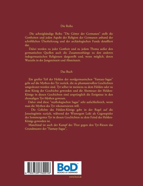 Die Reihe:Die achtzigbändige Reihe "Die Götter der Germanen" stellt die Gottheiten und jeden Aspekt der Religion der Germanen anhand der schriftlichen Überlieferung und der archäologischen Funde detailliert dar.Dabei werden zu jeder Gottheit und zu jedem Thema außer den germanischen Quellen auch die Zusammenhänge zu den anderen indogermanischen Religionen dargestellt und, wenn möglich, deren Wurzeln in der Jungsteinzeit und Altsteinzeit.Das Buch:Ein großer Teil der Helden der nordgermanischen "Fantasy-Sagas" geht auf die Mythen des Tyr zurück, die zu phantasievollen Geschichten umgedeutet worden sind. Tyr selber ist meistens zu dem Helden oder zu dem König der Geschichte geworden und die Abenteuer der Helden-Könige in diesen Geschichten sind die Ereignisse in den ehemaligen Tyr-Mythen.Daher sind diese "Mythologischen Sagas" sehr aufschlußreich, wenn man die Mythen des Tyr rekonstruieren will.Die Geliebte des Helden-Königs geht auf die Jenseitsgöttin zurück, während der WintergottLoki als Gegenspieler des Sommergottes Tyr in diesen Geschichten zu dem Feind des Helden-Königs geworden ist.Manchmal ist auch der Kampf des Thor gegen den Tyr-Riesen das Grundmuster der "Fantasy-Sagas".