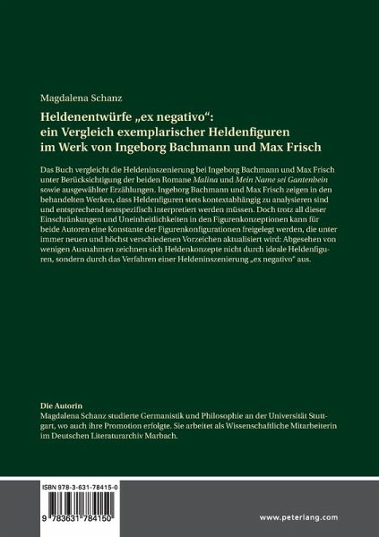 Das Buch vergleicht die Heldeninszenierung bei Ingeborg Bachmann und Max Frisch unter Berücksichtigung der beiden Romane Malina und Mein Name sei Gantenbein sowie ausgewählter Erzählungen. Ingeborg Bachmann und Max Frisch zeigen in den behandelten Werken, dass Heldenfiguren stets kontextabhängig zu analysieren sind und entsprechend textspezifisch interpretiert werden müssen. Doch trotz all dieser Einschränkungen und Uneinheitlichkeiten in den Figurenkonzeptionen kann für beide Autoren eine Konstante der Figurenkonfigurationen freigelegt werden, die unter immer neuen und höchst verschiedenen Vorzeichen aktualisiert wird: Abgesehen von wenigen Ausnahmen zeichnen sich Heldenkonzepte nicht durch ideale Heldenfiguren, sondern durch das Verfahren einer Heldeninszenierung «ex negativo» aus.