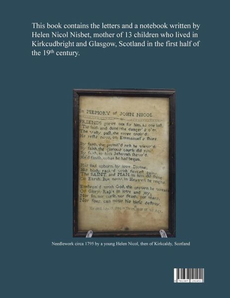 This book preserves the letters and notebook of Helen Nicol Nisbet (1778-1856), born in Kirkcaldy, Scotland. She married James Nisbet in 1796 and lived much of her life on St. Mary's Isle near Kirkcudbright where she raised her 13 children. She led a life of trial and turmoil but took great comfort in her firm religious beliefs. When she died at age 77, she had outlived seven of her children. Helen's letters and notebook paint a graphic picture of her daily life and the challenges of a woman/widow/mother in the early to mid-1800s in both rural and urban Scotland. After the early deaths of several sons and her husband, she faces on-going financial hardship and constant worry about the future of her unmarried children. She and several of her daughters are buried at Sighthill Cemetery in Glasgow.
