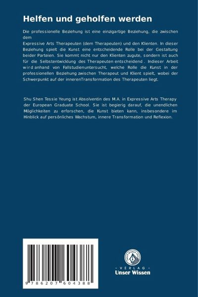Die professionelle Beziehung ist eine einzigartige Beziehung, die zwischen demExpressive Arts Therapeuten (dem Therapeuten) und den Klienten. In dieser Beziehung spielt die Kunst eine entscheidende Rolle bei der Gestaltung beider Parteien. Sie kommt nicht nur den Klienten zugute, sondern ist auch für die Selbstentwicklung des Therapeuten entscheidend . Indieser Arbeit wird anhand von Fallstudienuntersucht, welche Rolle die Kunst in der professionellen Beziehung zwischen Therapeut und Klient spielt, wobei der Schwerpunkt auf der innerenTransformation des Therapeuten liegt.