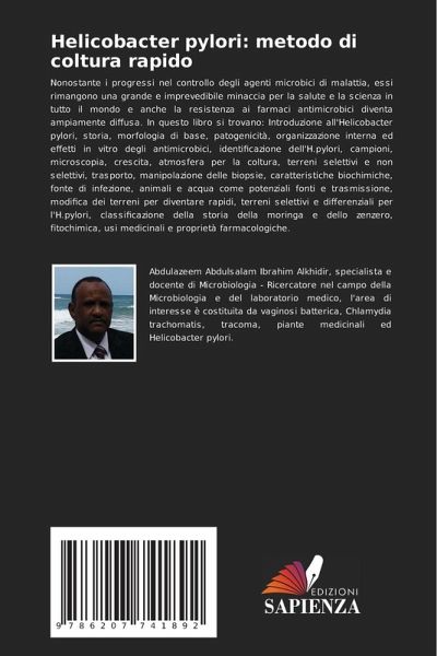 Nonostante i progressi nel controllo degli agenti microbici di malattia, essi rimangono una grande e imprevedibile minaccia per la salute e la scienza in tutto il mondo e anche la resistenza ai farmaci antimicrobici diventa ampiamente diffusa. In questo libro si trovano: Introduzione all'Helicobacter pylori, storia, morfologia di base, patogenicità, organizzazione interna ed effetti in vitro degli antimicrobici, identificazione dell'H.pylori, campioni, microscopia, crescita, atmosfera per la coltura, terreni selettivi e non selettivi, trasporto, manipolazione delle biopsie, caratteristiche biochimiche, fonte di infezione, animali e acqua come potenziali fonti e trasmissione, modifica dei terreni per diventare rapidi, terreni selettivi e differenziali per l'H.pylori, classificazione della storia della moringa e dello zenzero, fitochimica, usi medicinali e proprietà farmacologiche.