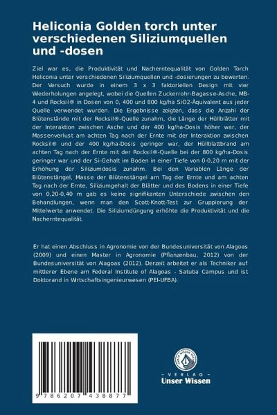 Ziel war es, die Produktivität und Nacherntequalität von Golden Torch Heliconia unter verschiedenen Siliziumquellen und -dosierungen zu bewerten. Der Versuch wurde in einem 3 x 3 faktoriellen Design mit vier Wiederholungen angelegt, wobei die Quellen Zuckerrohr-Bagasse-Asche, MB-4 und Rocksil® in Dosen von 0, 400 und 800 kg/ha SiO2-Äquivalent aus jeder Quelle verwendet wurden. Die Ergebnisse zeigten, dass die Anzahl der Blütenstände mit der Rocksil®-Quelle zunahm, die Länge der Hüllblätter mit der Interaktion zwischen Asche und der 400 kg/ha-Dosis höher war, der Massenverlust am achten Tag nach der Ernte mit der Interaktion zwischen Rocksil® und der 400 kg/ha-Dosis geringer war, der Hüllblattbrand am achten Tag nach der Ernte mit der Rocksil®-Quelle bei der 800 kg/ha-Dosis geringer war und der Si-Gehalt im Boden in einer Tiefe von 0-0,20 m mit der Erhöhung der Siliziumdosis zunahm. Bei den Variablen Länge der Blütenstängel, Masse der Blütenstängel am Tag der Ernte und am achten Tag nach der Ernte, Siliziumgehalt der Blätter und des Bodens in einer Tiefe von 0,20-0,40 m gab es keine signifikanten Unterschiede zwischen den Behandlungen, wenn man den Scott-Knott-Test zur Gruppierung der Mittelwerte anwendet. Die Siliziumdüngung erhöhte die Produktivität und die Nacherntequalität.