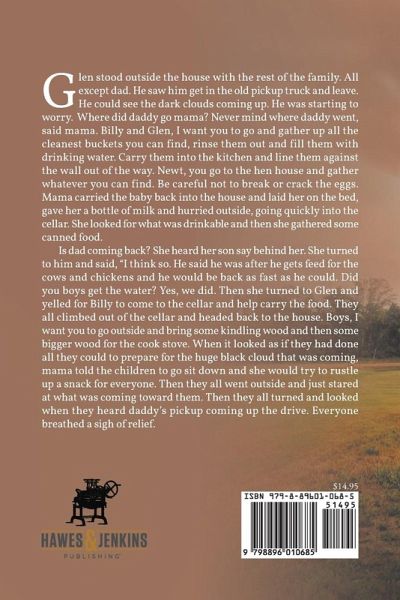 Glen stood outside the house with the rest of the family. All except dad. He saw him get in the old pickup truck and leave. He could see the dark clouds coming up. He was starting to worry. Where did daddy go mama? Never mind where daddy went, said mama. Billy and Glen, I want you to go and gather up all the cleanest buckets you can find, rinse them out and fill them with drinking water. Carry them into the kitchen and line them against the wall out of the way. Newt, you go to the hen house and gather whatever you can find. Be careful not to break or crack the eggs. Mama carried the baby back into the house and laid her on the bed, gave her a bottle of milk and hurried outside, going quickly into the cellar. She looked for what was drinkable and then she gathered some canned food. Is dad coming back? She heard her son say behind her. She turned to him and said, "I think so. He said he was after he gets feed for the cows and chickens and he would be back as fast as he could. Did you boys get the water? Yes, we did. Then she turned to Glen and yelled for Billy to come to the cellar and help carry the food. They all climbed out of the cellar and headed back to the house. Boys, I want you to go outside and bring some kindling wood and then some bigger wood for the cook stove. When it looked as if they had done all they could to prepare for the huge black cloud that was coming, mama told the children to go sit down and she would try to rustle up a snack for everyone. Then they all went outside and just stared at what was coming toward them. Then they all turned and looked when they heard daddy's pickup coming up the drive. Everyone breathed a sigh of relief