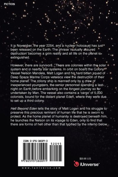 It is November, the year 2254, and a nuclear holocaust has just been released on the Earth. The phrase 'mutually assured destruction' becomes a grim reality and all life on the planet is extinguished. However, there are survivors.There are colonies within the solar system and in nearby star systems. In orbit on board the Colony Vessel Nelson Mandela, Matt Logan and his hard bitten squad of Deep Space Marine Corps veterans view the destruction of their home planet. The colony ship is manned only by a crew of inexperienced youngsters, the senior personnel spending a last night on Earth before embarking on the longest journey so far undertaken by Man. The vessel also contains a 'cargo' of 5,000 colonists, bound for the distant planet Eden, where they were due to set up a third colony. Hell Beyond Eden tells the story of Matt Logan and his struggle to preserve this precious remnant of human life that he is sworn to protect. As the home planet of humanity is destroyed beneath him, he launches the Nelson on its voyage to Eden, only to find that there are forms of hell other than that typified by the inferno below.