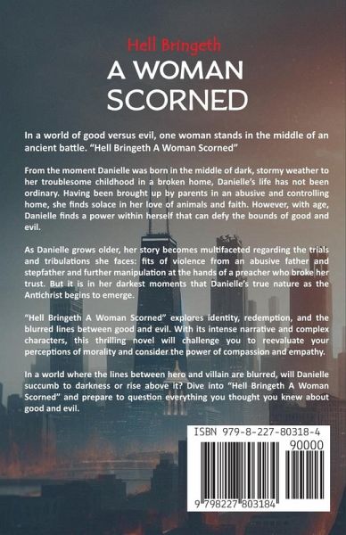 In a battle where the lines between good and evil blur, "Hell Bringeth A Woman Scorned" will grip your soul and challenge everything you believe about morality. ¿ ¿ ¿ ¿ ¿ In a world of good versus evil, one woman stands in the middle of an ancient battle. From the moment Danielle was born amidst dark, stormy weather to her turbulent childhood in a broken home, her life has been anything but ordinary. Raised in an abusive and controlling environment, Danielle finds solace in her love of animals and her faith. However, as she grows older, Danielle discovers a power within herself that can defy the very bounds of good and evil. Hell Bringeth A Woman Scorned tells the compelling story of Danielle's journey through a life filled with trials and tribulations. Facing fits of violence from an abusive father and stepfather, and further manipulation at the hands of a preacher who broke her trust, Danielle's darkest moments reveal her true nature as the Antichrist. This gripping novel explores themes of identity, redemption, and the blurred lines between good and evil. With an intense narrative and complex characters, "Hell Bringeth A Woman Scorned" will challenge your perceptions of morality and highlight the power of compassion and empathy. In a world where the lines between hero and villain are blurred, will Danielle succumb to darkness or rise above it? Dive into this excellent novel and prepare to question everything you thought you knew about good and evil. Why You Should Buy This Book: Intense Narrative: Experience a story that keeps you on the edge of your seat. Complex Characters: Engage with deeply developed characters that will challenge your views on morality. Thought-Provoking Themes: Explore themes of identity, redemption, and the nature of good and evil. Emotional Depth: Witness Danielle's journey through pain, betrayal, and the discovery of her true self.