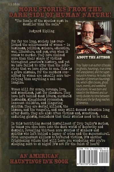 HELL HATH NO FURY 2 13 MORE SPIRITS OF DEPRAVITY AND DESPAIR BY TROY TAYLOR "The female of the species must be deadlier than the male." Rudyard Kipling For far too long, society has overlooked the achievements of women - in business, politics, science, education, war, literature, and yes, even when it comes to murder. They have claimed more than their share of victims throughout America's history, and yet we have failed to offer them the notoriety that we have given to men. This is a grave mistake, for the murders committed by women are usually more terrifying than anything a man can imagine. Women kill for money, revenge, love, and sometimes, just for pleasure. They have left behind dead lovers, murdered husbands, slaughtered roommates, innocent children, and lingering spirits. They are serial killers, the insane, and the vengeful, and many still demand attention long after death. They are also often victims and, sometimes, enduring ghosts, reminders that their stories need to be told. In this terrifying second installment of Troy Taylor's series, he takes you once more into the dark world of depravity and despair, revealing thirteen more stories of sinners and spirits who left behind a legacy of crime and the supernatural. From unrepentant killers to tortured victims, it's another frightening volume that will leave you wondering who you're sleeping next to at night! It's not for the faint of heart!