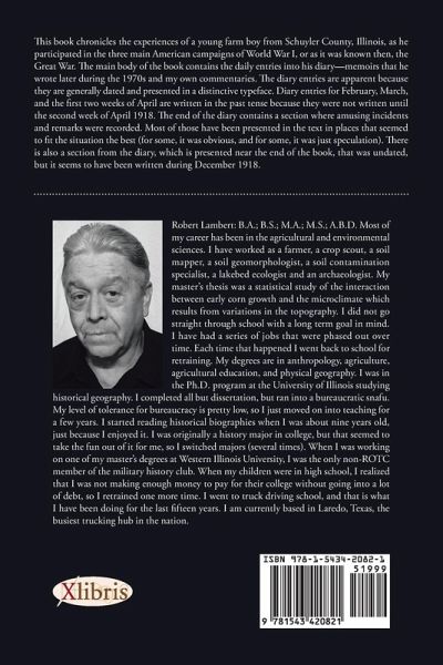 This book chronicles the experiences of a young farm boy from Schuyler County, Illinois, as he participated in the three main American campaigns of World War I, or as it was known then, the Great War. The main body of the book contains the daily entries into his diary?memoirs that he wrote later during the 1970s and my own commentaries. The diary entries are apparent because they are generally dated and presented in a distinctive typeface. Diary entries for February, March, and the first two weeks of April are written in the past tense because they were not written until the second week of April 1918. The end of the diary contains a section where amusing incidents and remarks were recorded. Most of those have been presented in the text in places that seemed to fit the situation the best (for some, it was obvious, and for some, it was just speculation). There is also a section from the diary, which is presented near the end of the book, that was undated, but it seems to have been written during December 1918.
