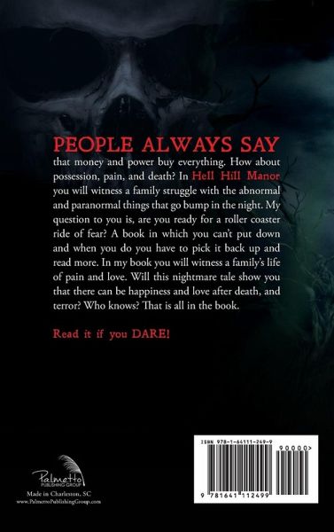 People always say that money and power buy everything. How about possession, pain, and death? In Hell Hill Manor you will witness a family struggle with the abnormal and paranormal things that go bump in the night. My question to you is, are you ready for a roller coaster ride of fear? A book in which you can't put down and when you do you have to pick it back up and read more. In my book you will witness a family's life of pain and love. Will this nightmare tale show you that there can be happiness and love after death, and terror? Who knows? That is all in the book. Read if you DARE!
