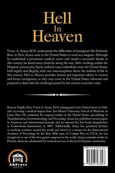Victor A. Arana, M.D. understands the difficulties of immigrant life firsthand. Born in Peru, Arana came to the United States to work as a surgeon. Although he established a prominent medical career and raised a successful family in this country, he faced many obstacles along the way. After working amidst the Hispanic community, Arana realized many individuals enter the United States, both legally and illegally, with vast misconceptions about the realities of life in this country. Hell in Heaven provides honest and important advice to current and future immigrants, so they may come to the United States informed