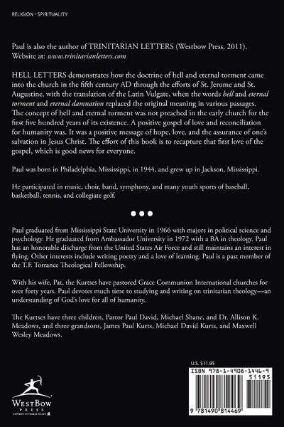 Paul is also the author of TRINITARIAN LETTERS (Westbow Press, 2011). Website at: www.trinitarianletters.com HELL LETTERS demonstrates how the doctrine of hell and eternal torment came into the church in the fifth century AD through the efforts of St. Jerome and St. Augustine, with the translation of the Latin Vulgate, when the words hell and eternal torment and eternal damnation replaced the original meaning in various passages. The concept of hell and eternal torment was not preached in the early church for the first five hundred years of its existence. A positive gospel of love and reconciliation for humanity was. It was a positive message of hope, love, and the assurance of one's salvation in Jesus Christ. The effort of this book is to recapture that first love of the gospel, which is good news for everyone. Paul was born in Philadelphia, Mississippi, in 1944, and grew up in Jackson, Mississippi. He participated in music, choir, band, symphony, and many youth sports of baseball, basketball, tennis, and collegiate golf.